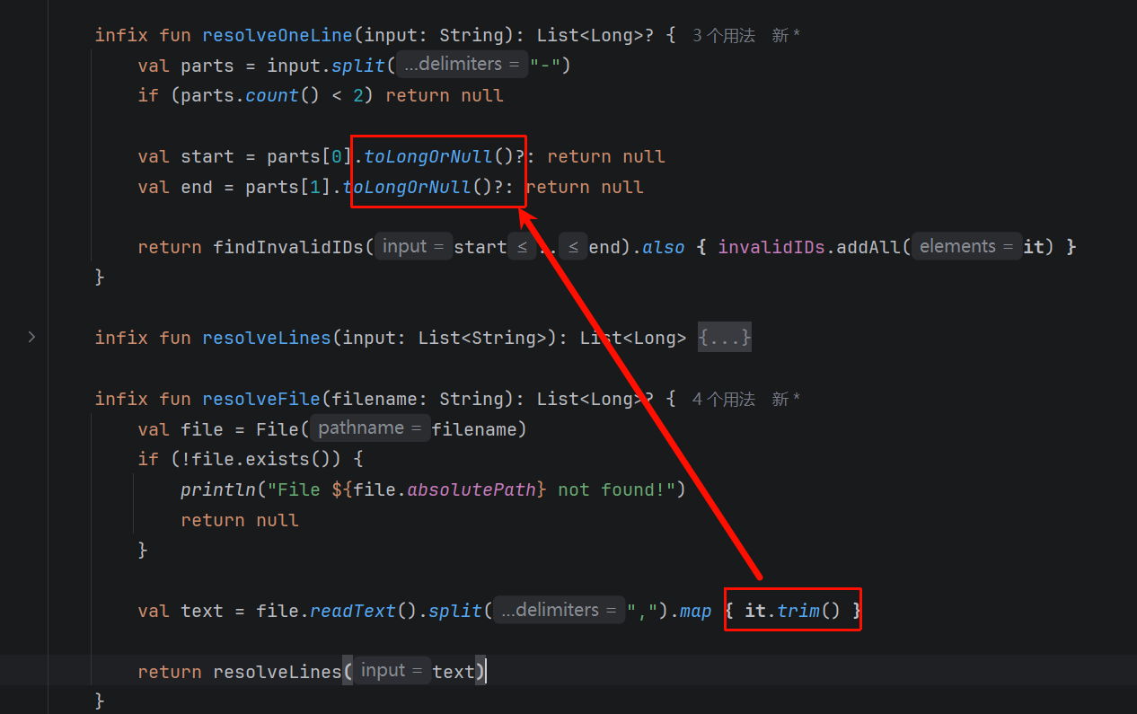 println(str.trim()) // 输出: Hello World题目中用于移除Windows文件末尾可能的\r\n字符,避免影响toLongOrNull的解析: