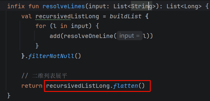 println(flattened) // 输出: [1, 2, 3, 4, 5, 6]题目中用于展开resolveLines函数的中间结果List<List<Long>>: