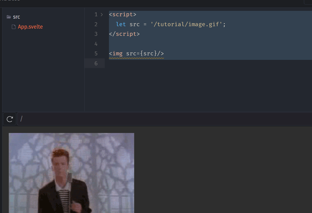 <img src={src} alt="A {name} is singing Never gonna give you up"/>记得先定义变量再使用