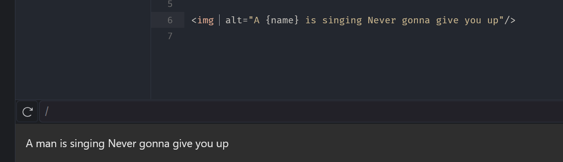<img src={src} alt="Never gonna give you up"/>可以结合前面的数据添加和渲染让alt文本“动起来”: