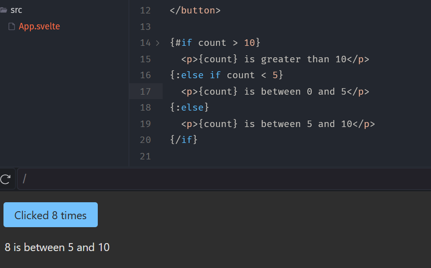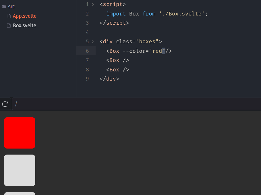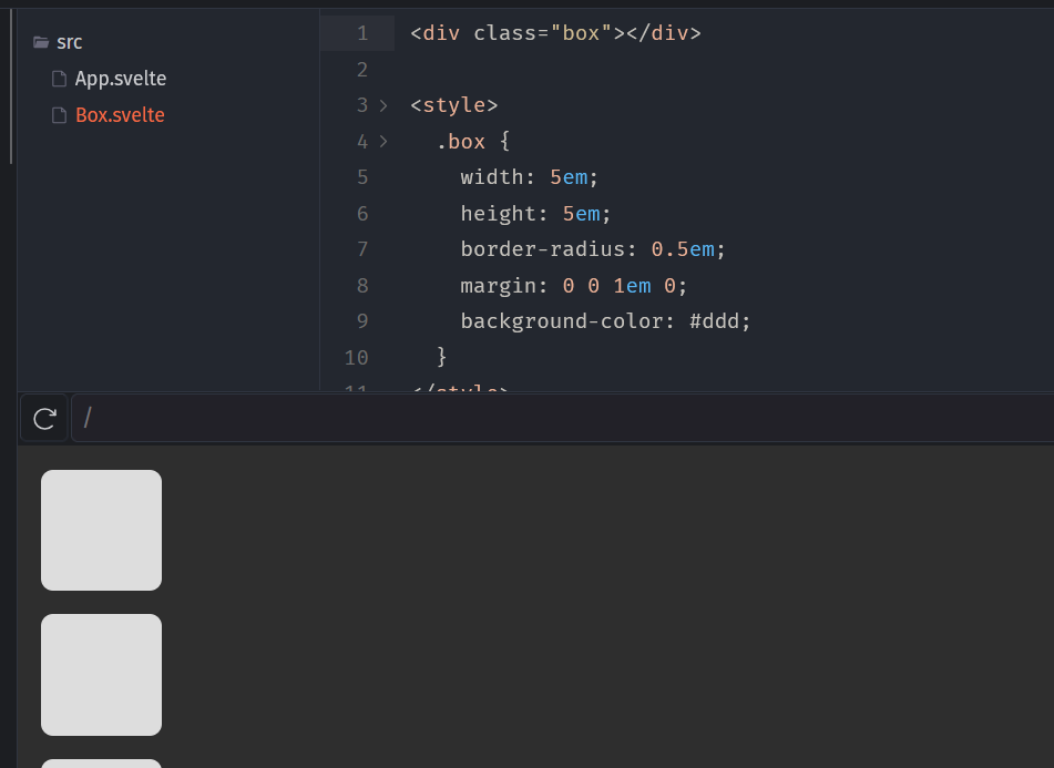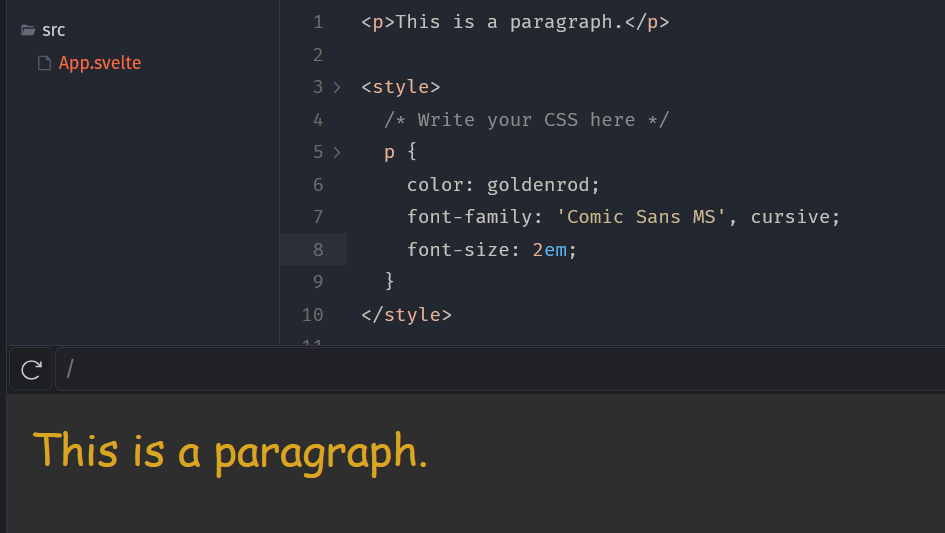 <p>的CSS样式只在App.svelte这一个组件里有效,我们不用担心会在其他组件里改到这边的<p>自定义样式——下一节就会演示这个
