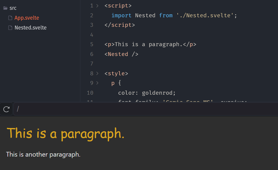 注意到即使是这样,App组件的文本受到App内样式的影响,而从Nested组件导入进来的元素<p>This is another paragraph.</p>却没有被App内样式影响