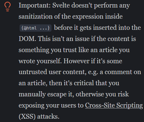 如果要渲染的文本是用户可控的,svelte建议你自己手动再转义一次