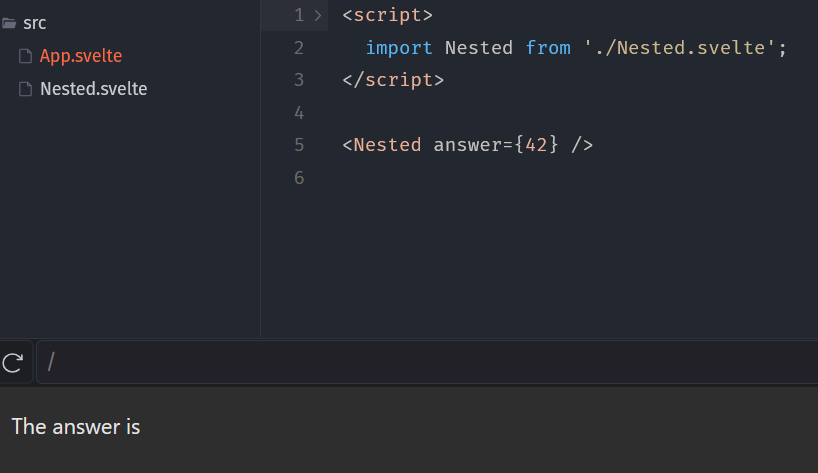 这一关的Demo里同目录下多了一个文件Nested.svelte。我们在App.svelte顶部加个: