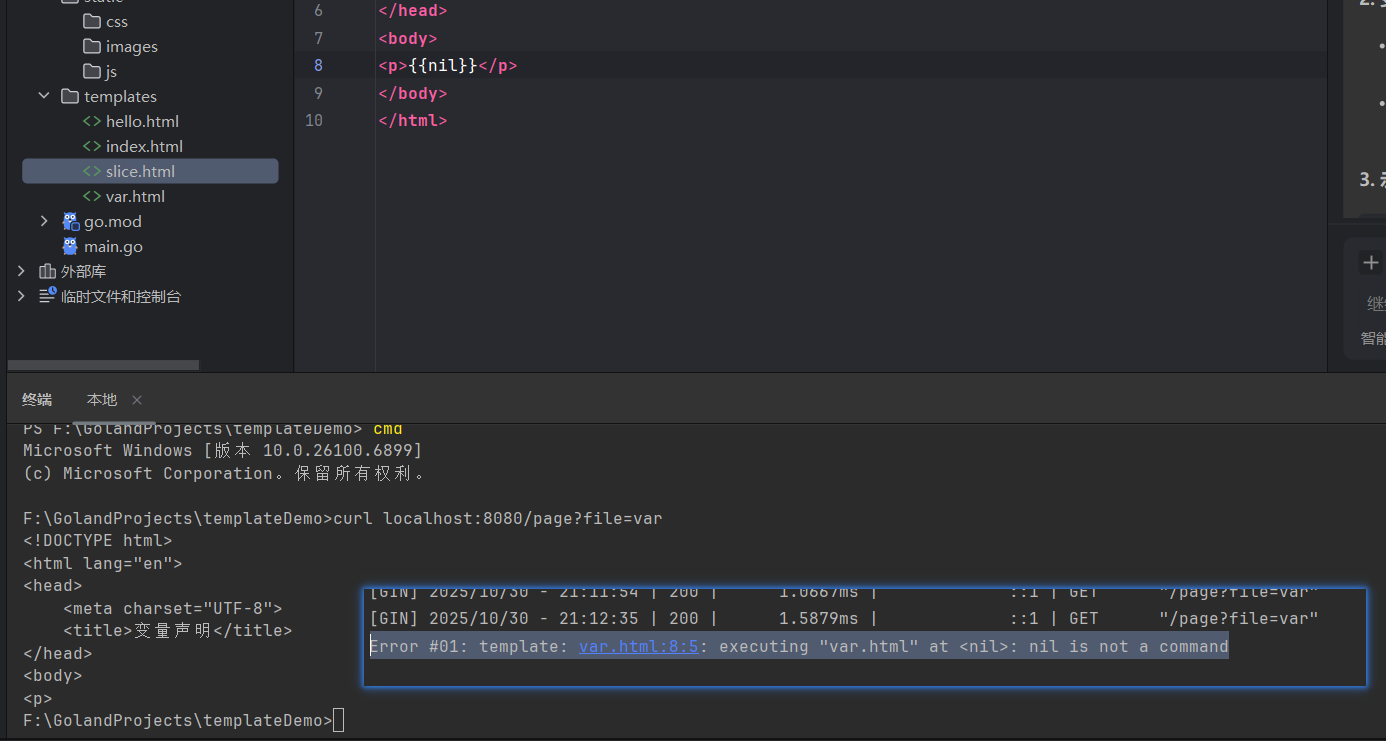 :=,而修改和访问变量时使用=;如{{$avr := "abc"}} - 变量必须先声明再使用