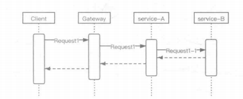 客户端发起了一次请求Request1,网关在接受到请求后将它转发给service-A,由于这次请求涉及到了service-B中的数据,所以service-A又向service-B发起了一次请求Request1-1来获取对应的数据,在处理结束后将结果返回给网关,由网关将结果返回给客户端。上图10-1中Request1和Request1-1共同组成了这次调用的调用链。