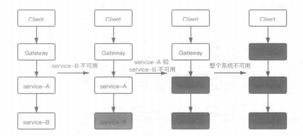 服务雪崩是指当调用链的某个环节(特别是服务提供方的服务)不可用时,导致了上游环节不可用,并最终将这种影响像雪崩一样扩大到整个系统中,导致了整个系统不可用的情况