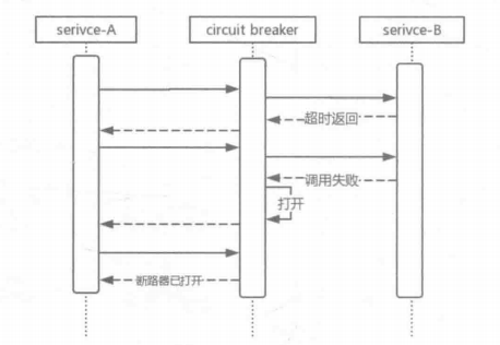 如上图所示,我们在service-A向service-B的请求中增加了一根“保险丝”,即断路器。它会统计一段时间内service-A对service-B请求响应结果,在超时或者失败次数过多的情况下,阻断service-A对service-B的请求,直接返回相关的异常处理结果,使得service-A中的请求线程能够及时返回,避免资源耗尽而不可用,从而保护了服务调用者,避免了服务级联失败