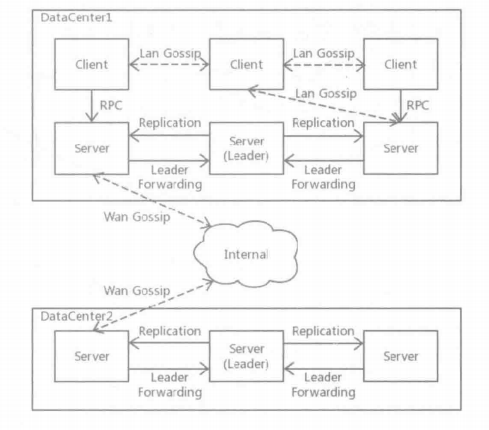 - Consul Server:它是数据存储和复制的地方。通过多个Server部署高可用集群(官方建议3个或者3个以上)。多个Server之间通过Raft协议选举一个Leader。在上图 中存在两个数据中心,分别为DataCenter1和DataCenter2。同一数据中心中的Server保持数据强一致性,当出现跨数据中心服务发现或配置请求时,本地Server会将请求转发到远程数据中心处理。不同数据中心的Server之间的数据不会发生同步