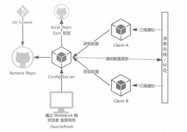 用启动时从配置仓库拉取相对应的配置文件信息,并订阅消息总线指定的topic。当配置新提交时,触发配置仓库的 WebHook,或者手动调用 Config Server 更新事件的端点/bus/refresh,发送更新事件到消息队列,客户端服务根据收到的更新事件决定是否更新本地的配置。