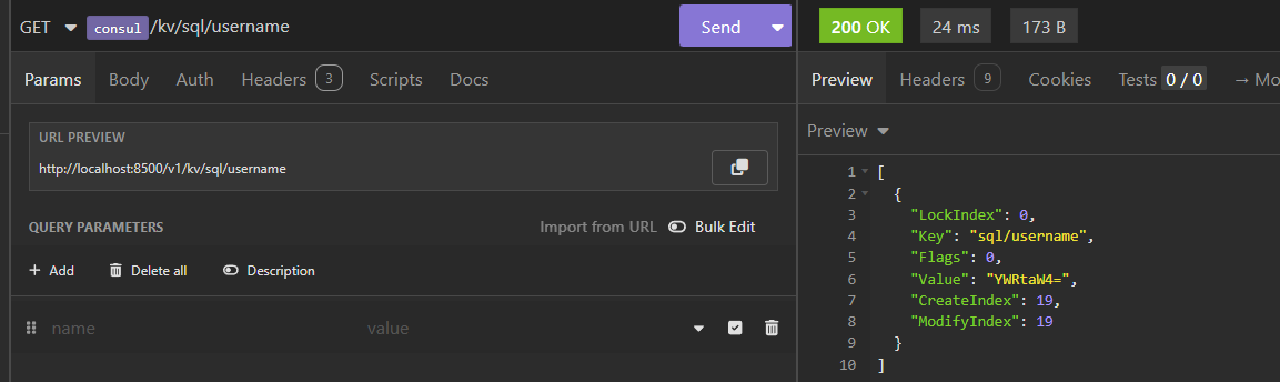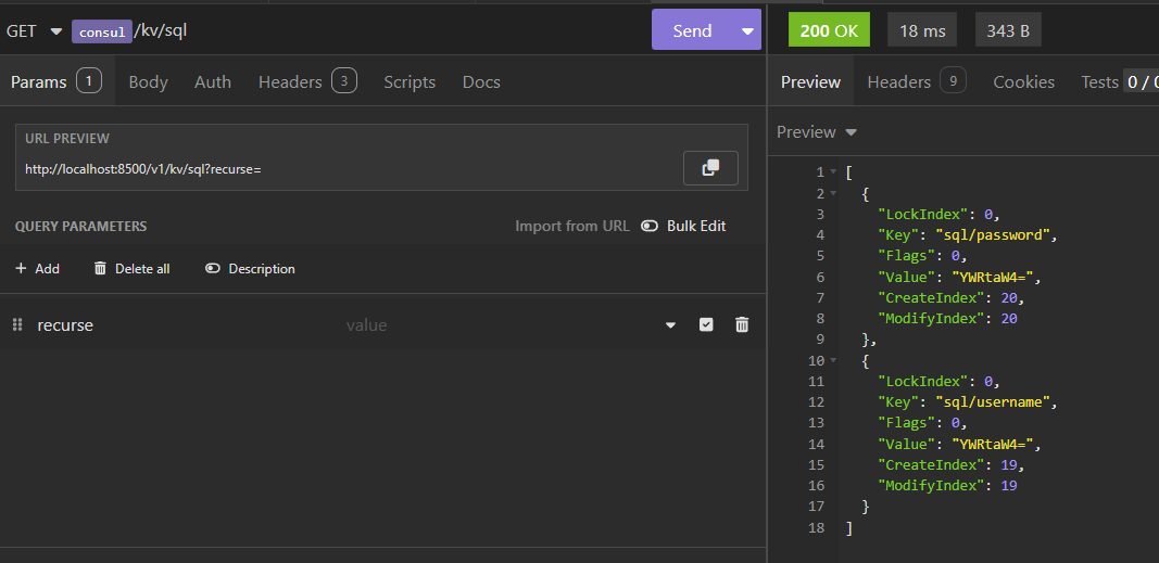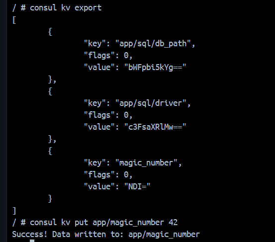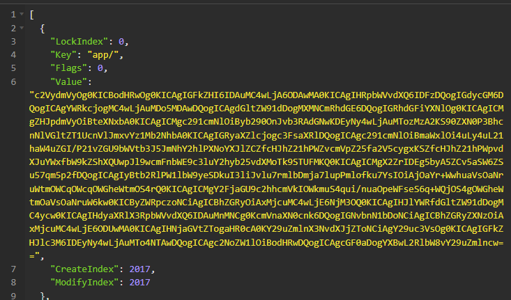 consul kv export:导出所有KV/ # consul kv put http/schema http Success! Data written to: http/schema / # consul kv put http/domain example.com Success! Data written to: http/domain / # consul kv put http/port 8080 Success! Data written to: http/port / # consul kv export [ { "key": "42", "flags": 0, "value": "" }, { "key": "a/b/c", "flags": 0, "value": "NDI=" }, { "key": "http/domain", "flags": 0, "value": "ZXhhbXBsZS5jb20=" }, { "key": "http/port", "flags": 0, "value": "ODA4MA==" }, { "key": "http/schema", "flags": 0, "value": "aHR0cA==" } ]consul kv get:获取单个KV/ # consul kv get http/schema http / # consul kv get http Error! No key exists at: httpconsul kv get -detailed:-detailed参数用于获取详细的单个KV信息/ # consul kv get -detailed sql/private/account/username CreateIndex 75 Flags 42 Key sql/private/account/username LockIndex 0 ModifyIndex 75 Session - Value adminconsul kv get -recurse:递归获取所有K/ # consul kv get -recurse 42: # 这个没有显式设置值 a/b/c:42 http/domain:example.com http/port:8080 http/schema:http sql/private/account/username:admin