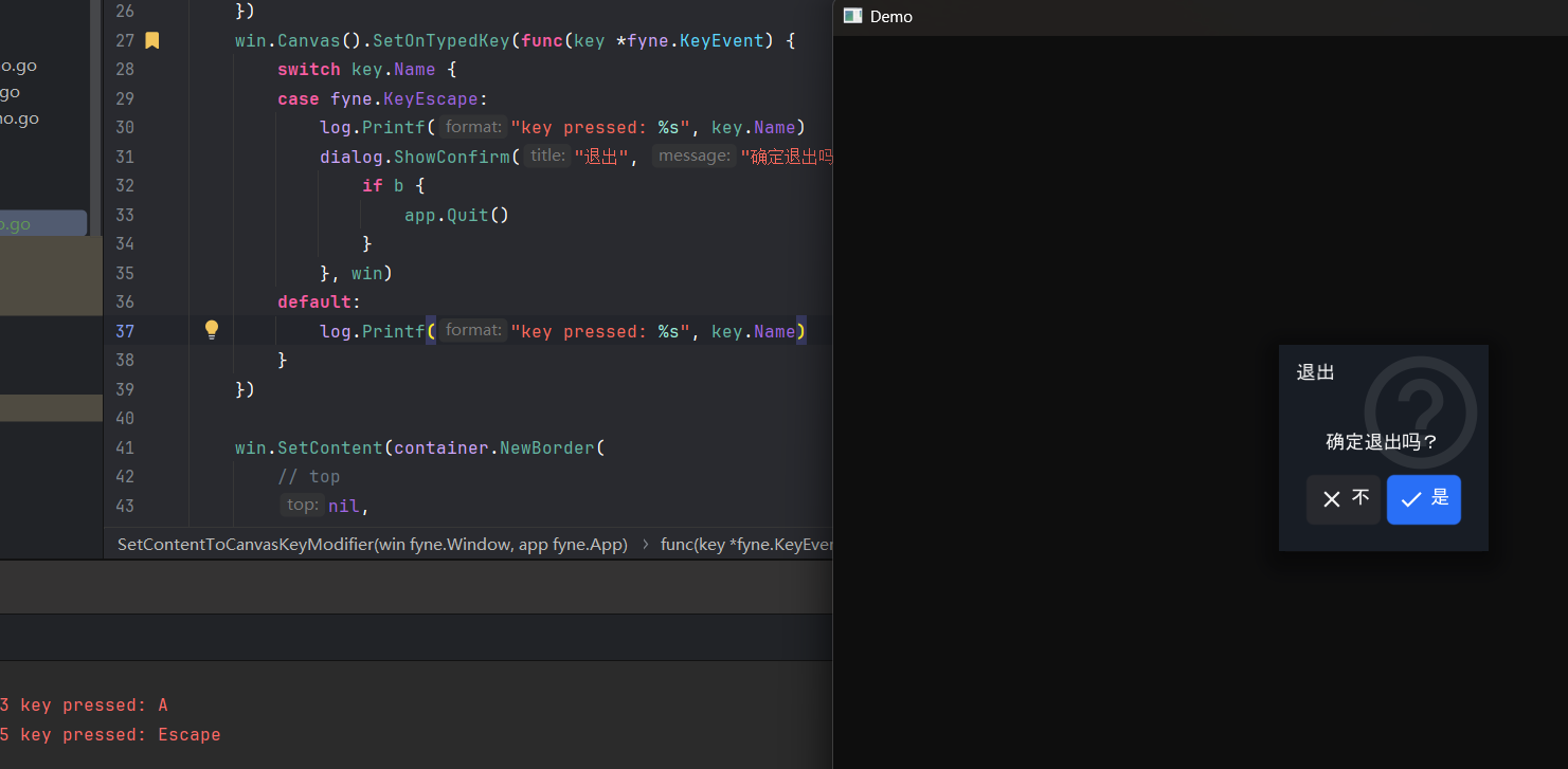 上面的代码演示了如何实现一个TypedShortcut监听器。在函数内你应该检查输入的快捷键是否为你预期的类型。如果快捷键已包含在fyne库中,你应该直接调用原本的快捷键监听器(如果widget组件本身就有一个)。做完这些检查后你就可以判断快捷键是你正在处理的哪一个组合了(如果有很多个组合键的话)