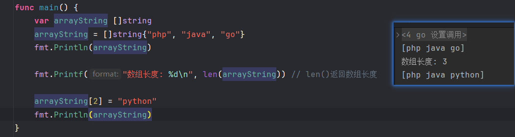 fmt.Println(stringA) // [go java moonbit php] // 疑似按首字符码值排序