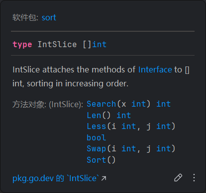 }注意Sort方法接受的是sort Interface,一个封装了数组长度、元素交换方法和元素排序方法的结构体;而IntSlice系列方法做的就是把传入的数组属性贴到sort Interface后面,再返回这个接口,供sort的其他通用方法使用