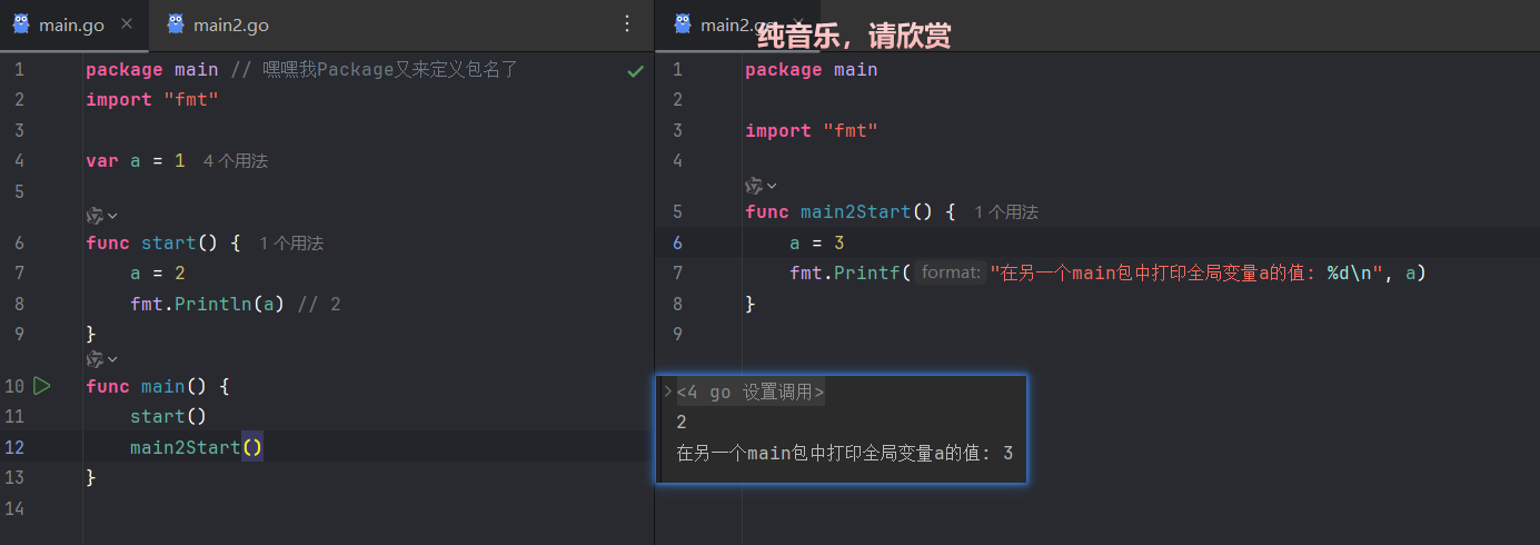 }package命名相同的文件被视为同一个包,共享全局变量和函数
