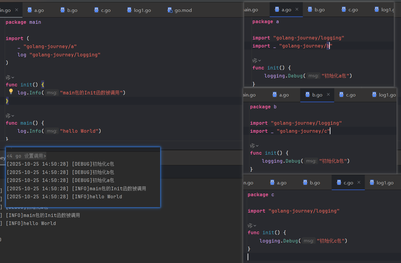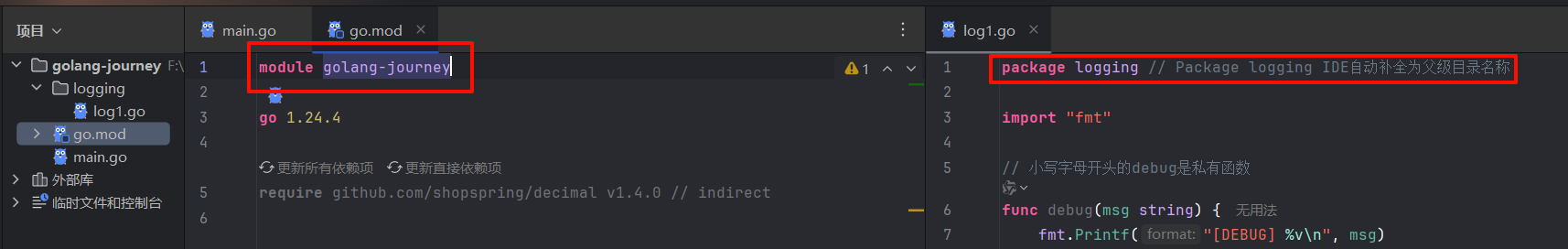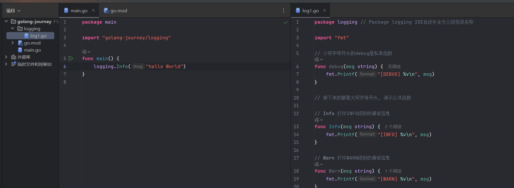 }主Module名为golang-journey,自定义包路径位于根目录,package名为logging,因此导入路径为golang-journey/logging