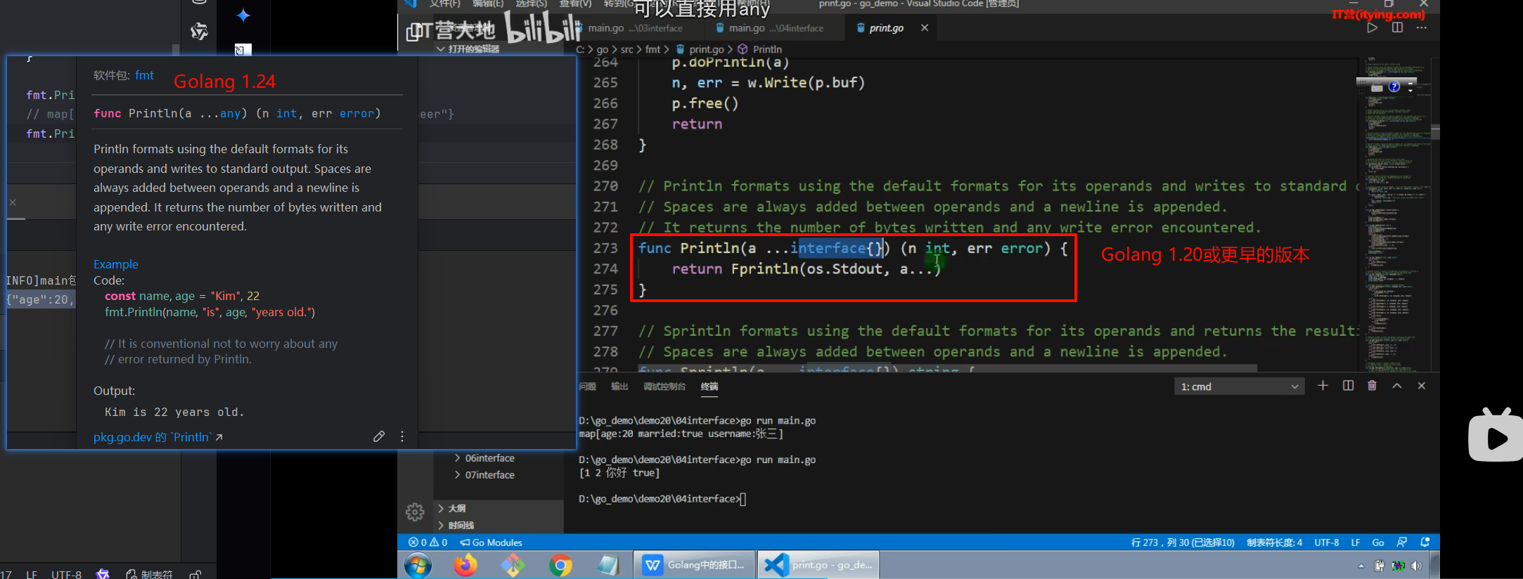下面是一个any切片,有字符串、整型,还有另一个切片