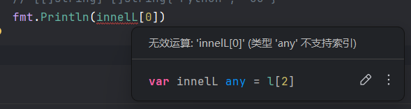 fmt.Println(innelL.([]string)[0]) // x.(T)会返回两个返回值, 这里实际上默认断言成功了, 实战还是不要这么写