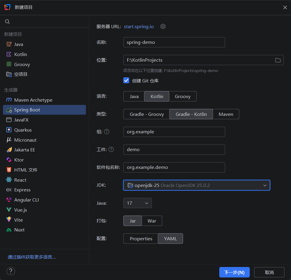 kotlin("jvm"): 这是基础。它告诉 Gradle 这是一个 Kotlin 项目,并指定了编译器版本,确保你的代码能被编译成运行在 Java 虚拟机(JVM)上的字节码。kotlin("plugin.spring")(All-open 插件): 这是最关键的一环。 在 Kotlin 中,类默认是final的(不可被继承)。但 Spring 的很多核心功能(如@Transactional或 AOP)需要通过创建子类代理来实现。 这个插件会自动为标注了 Spring 注解的类添加open修饰符,让你不需要手动在每个类前面写open。
