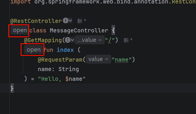 Kotlin的普通类(不是抽象类)默认是final的,不可被继承的——而Spring的机制就是要继承Controller类之后实现一个新的子类,并调用这个子类处理请求,所以原生Kotlin + Spring在使用@RestController注解后还需要加上open关键字,修饰当前类为可继承的。kotlin-allopen插件可以自动处理这个流程