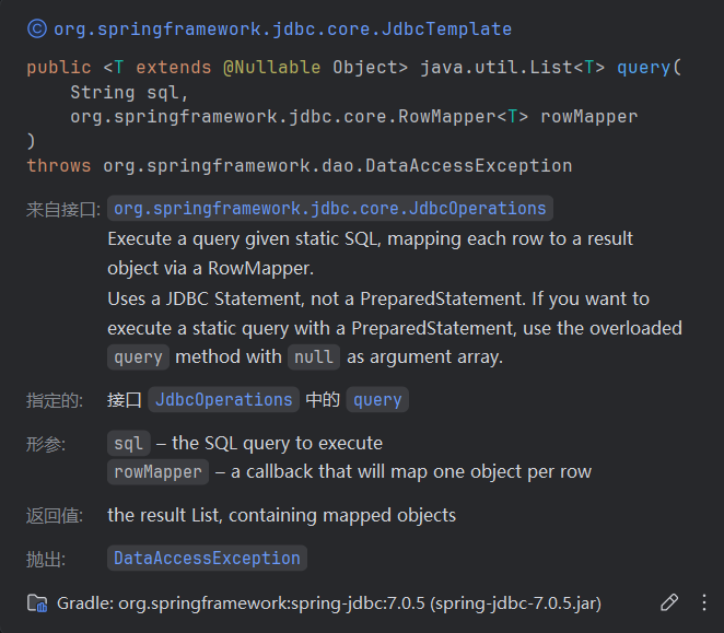 }db.query第二个参数对应rowMapper,是一个回调函数——这里因为回调函数同时是函数的db.query的最后一个参数,因此看上去是挂在db.query()外面的lambda函数,也就是trailing lambda特性