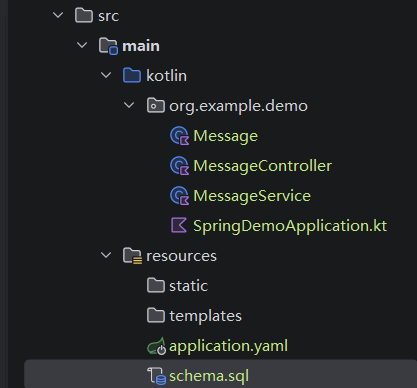 在Spring框架中,Controller是用来处理web请求的。在com.example.demo(和Main.kt一个层级)下创建MessageController.kt: