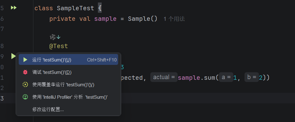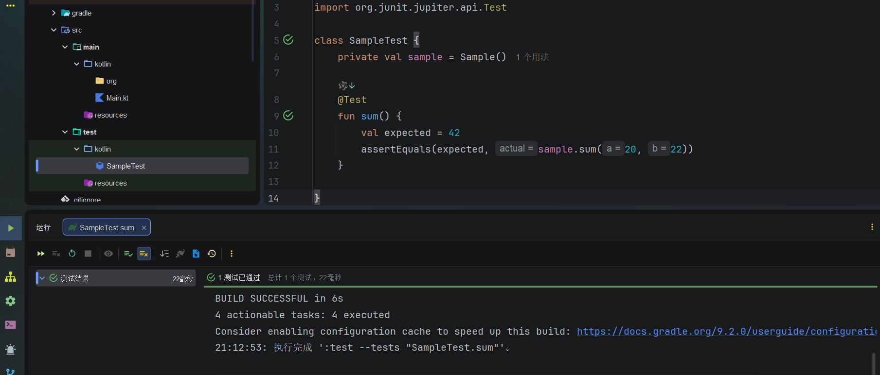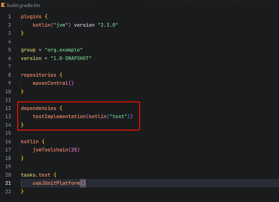打开build.gradle.(kts)文件并检查testImplementation依赖是否存在。这个依赖允许你使用kotlin.test和JUnit进行单元测试: