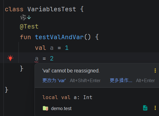 var 变量名称 : 变量类型 = 值val:声明不可变变量