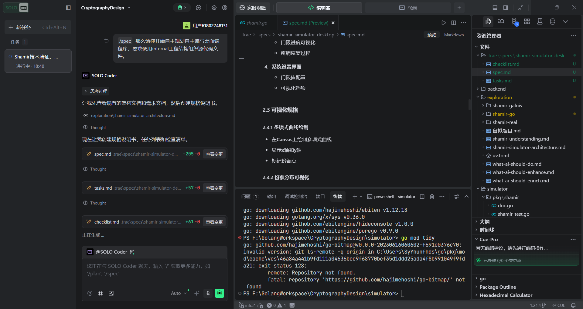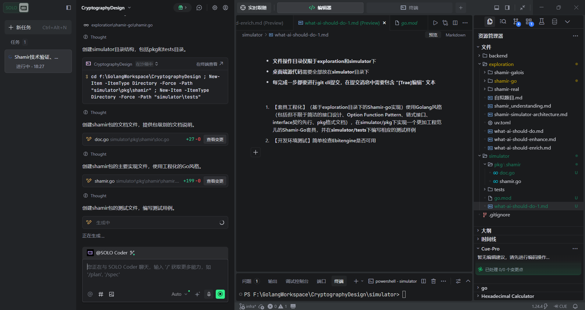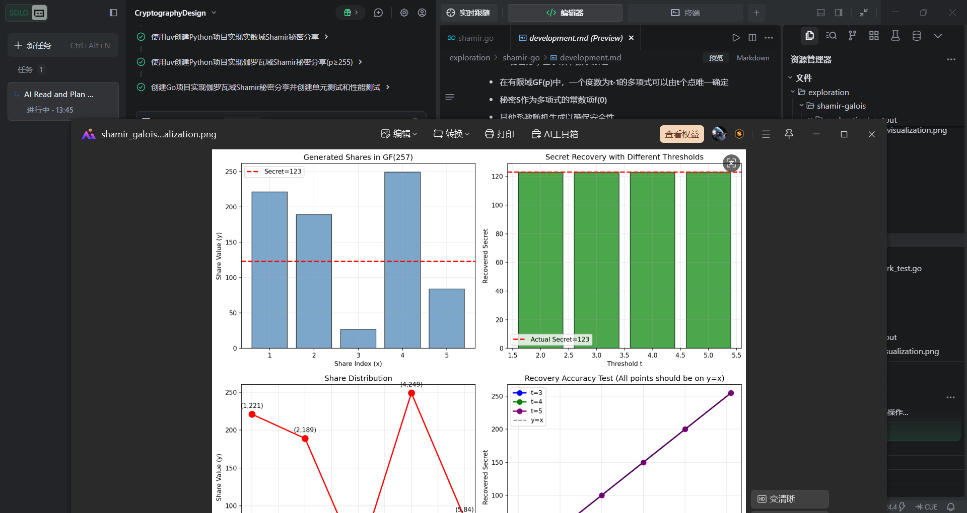 4. (第三步的基础上)在exploration目录下创建Go空项目,自行联网搜索寻找工程实现,(可以依赖第三方库,只要记得go get即可)开发支持任意实数p的伽罗瓦域Shamir秘密分享算法套具,自行创建单元测试和性能基准测试