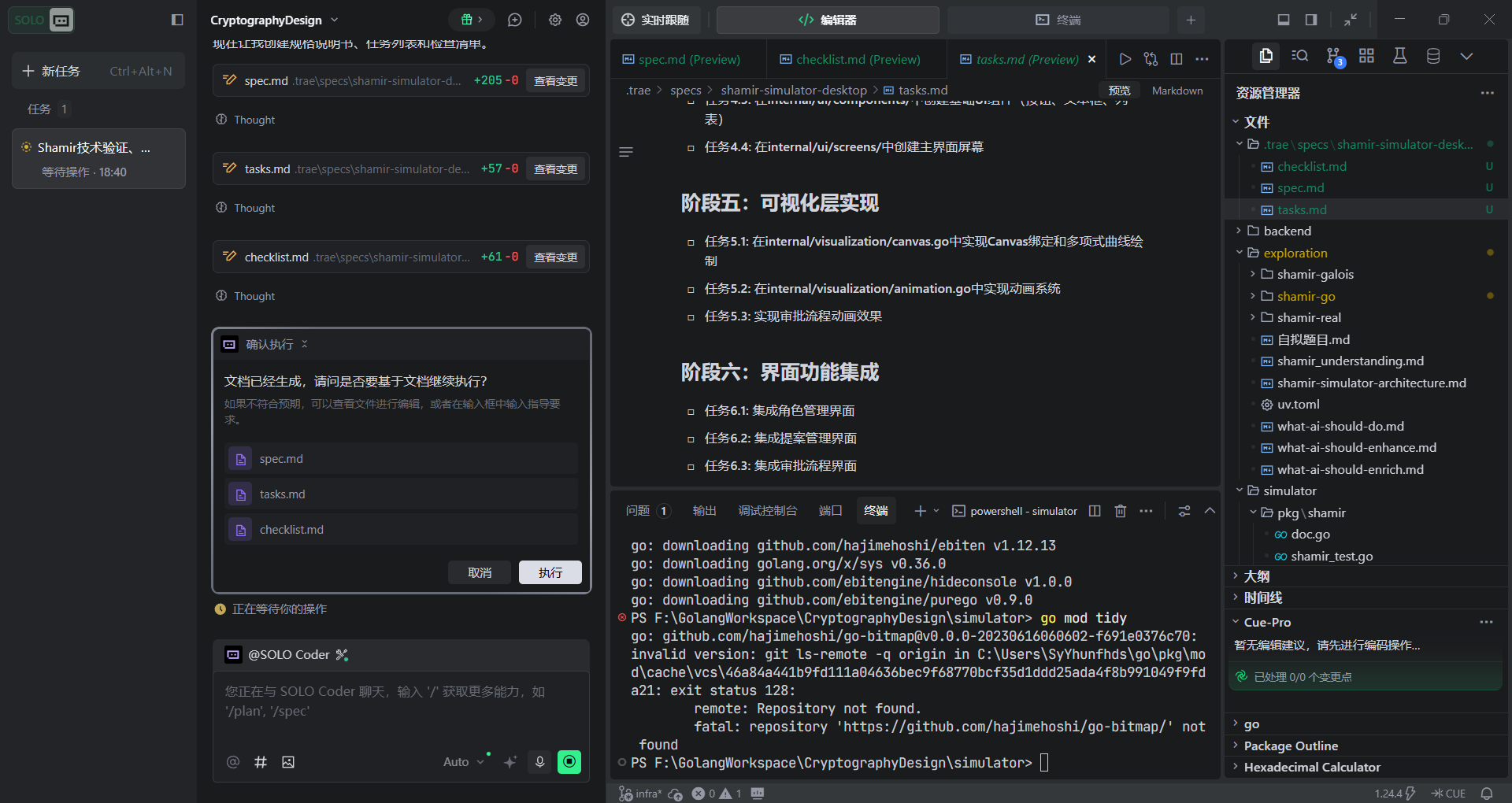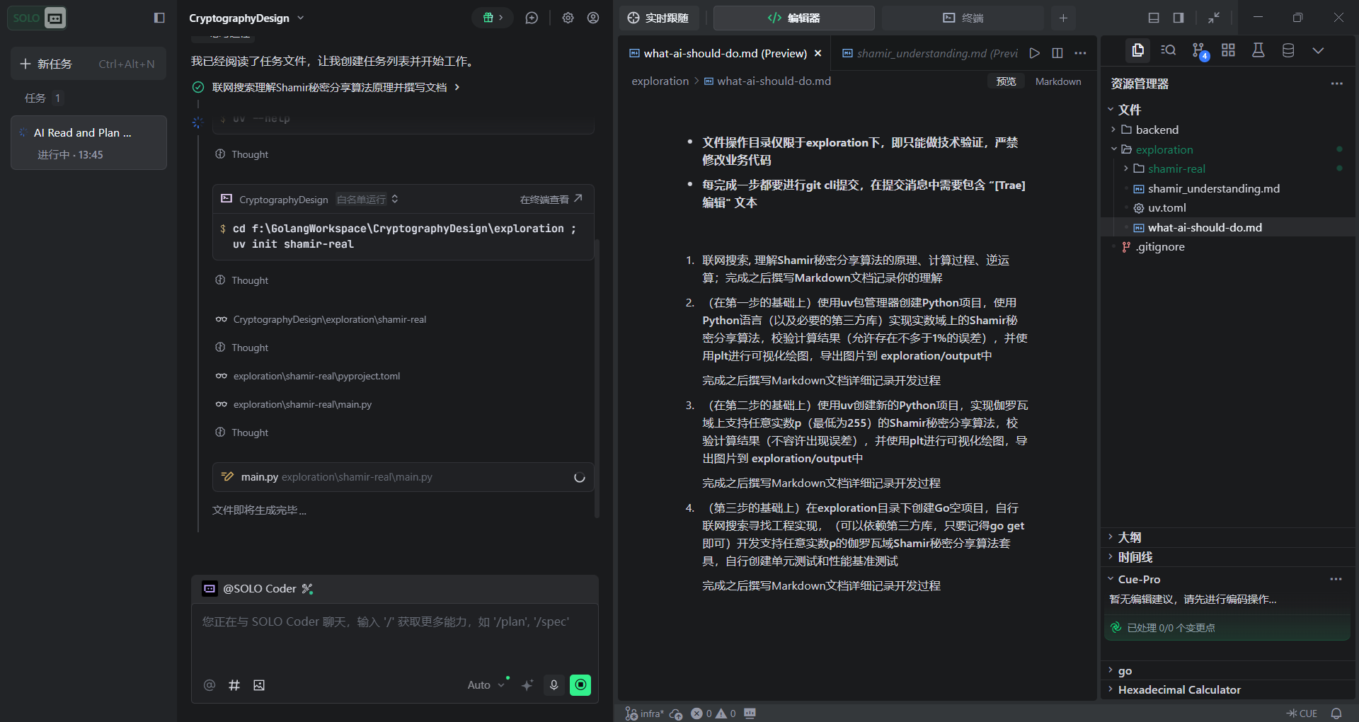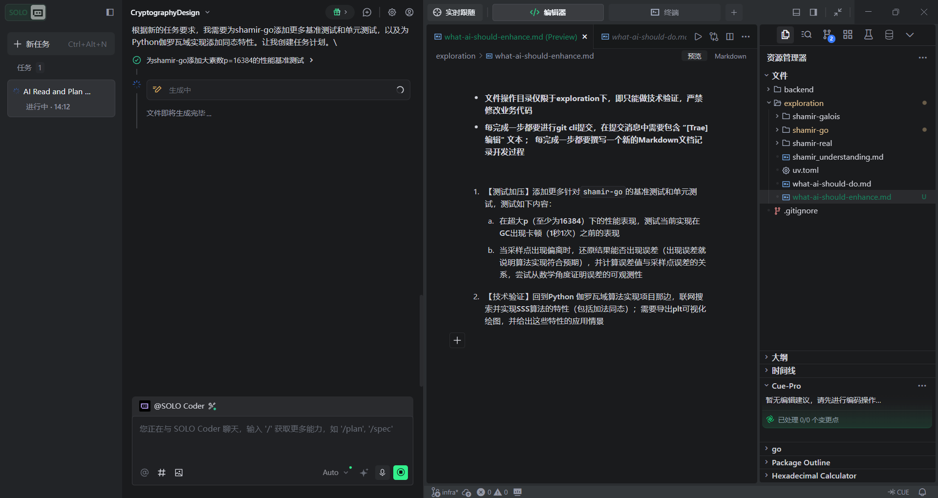 4. (第三步的基础上)在exploration目录下创建Go空项目,自行联网搜索寻找工程实现,(可以依赖第三方库,只要记得go get即可)开发支持任意实数p的伽罗瓦域Shamir秘密分享算法套具,自行创建单元测试和性能基准测试