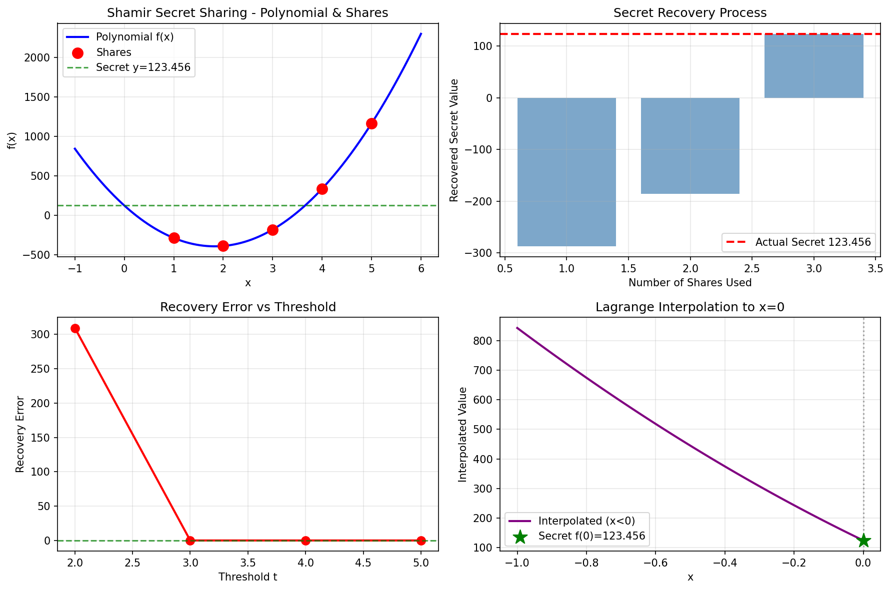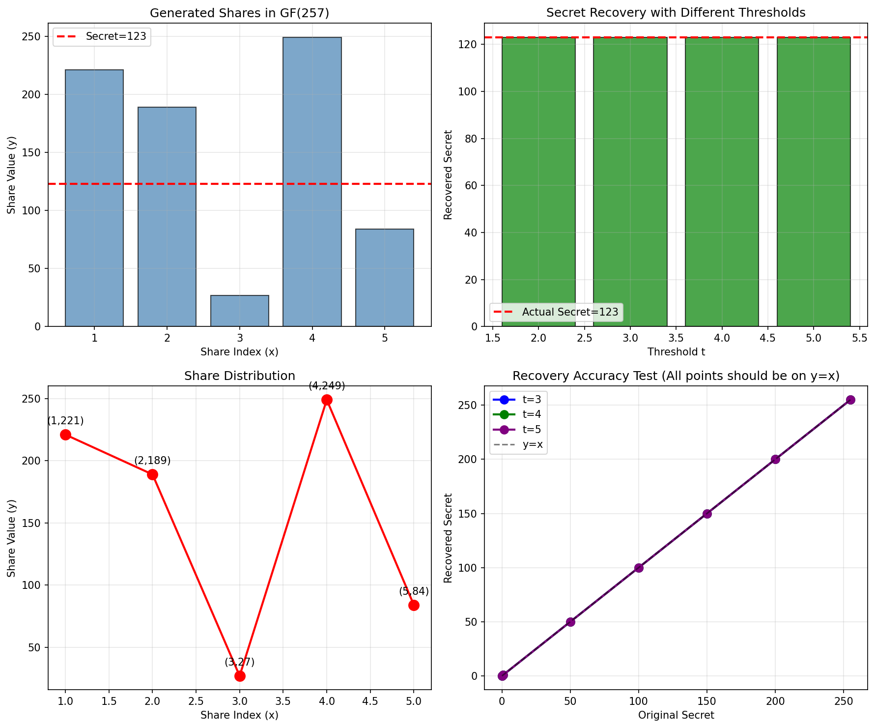 3. (在第二步的基础上)使用uv创建新的Python项目,实现伽罗瓦域上支持任意实数p(最低为255)的Shamir秘密分享算法,校验计算结果(不容许出现误差),并使用plt进行可视化绘图,导出图片到 exploration/output中