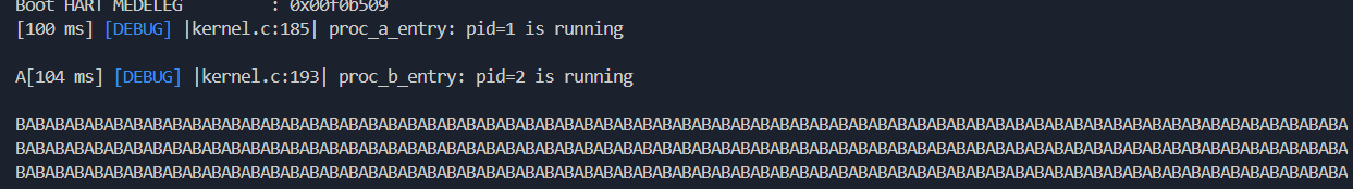 proc_a_entry函数和proc_b_entry函数分别是进程 A 和进程 B 的入口点。使用putchar函数显示单个字符后,它们使用switch_context函数切换到另一个进程。delay函数实现了一个忙等待,以防止字符输出过快导致终端无响应。nop指令是一个“什么都不做”的指令。添加它是为了防止编译器优化删除循环。