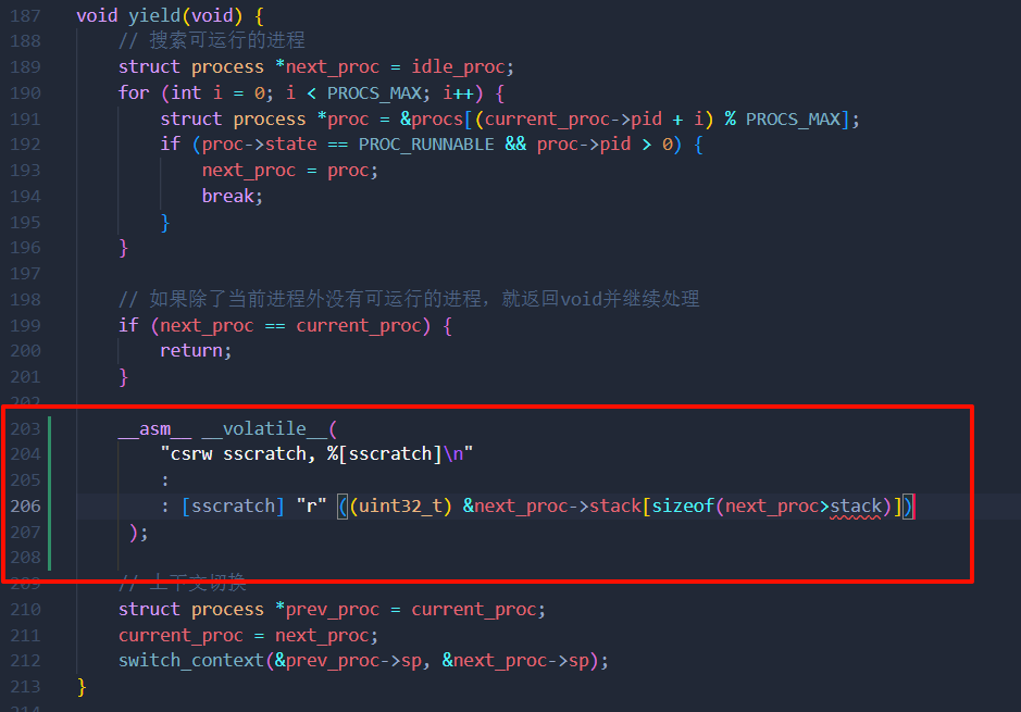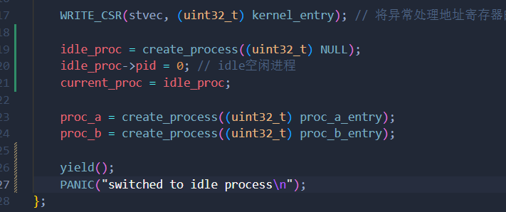 这个初始化过程的关键点是current_proc = idle_proc。这确保了引导进程的执行上下文被保存并作为空闲进程的上下文恢复。在第一次调用yield函数期间,它从空闲进程切换到进程 A,当切换回空闲进程时,它的行为就像从这个yield函数调用返回一样。