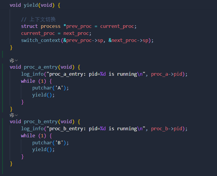 proc_a_entry和proc_b_entry如下,调用yield函数而不是直接调用switch_context函数