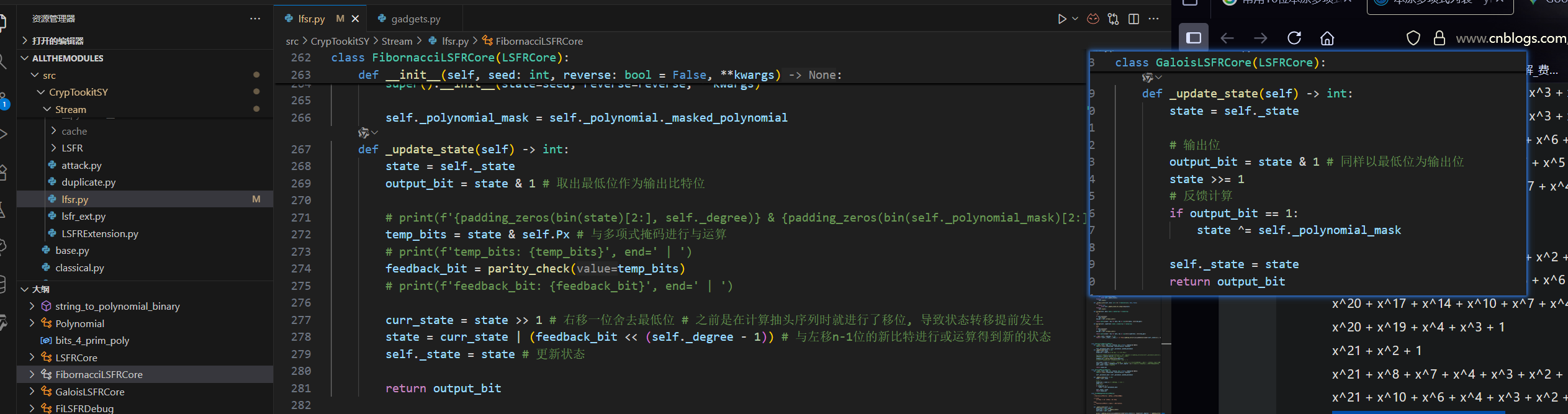 print(f'C(x) = "{test_str}" -> Polynomial={bin(result)} (0b{bin(result)[2:]})')为LFSR加上非线性密钥输出